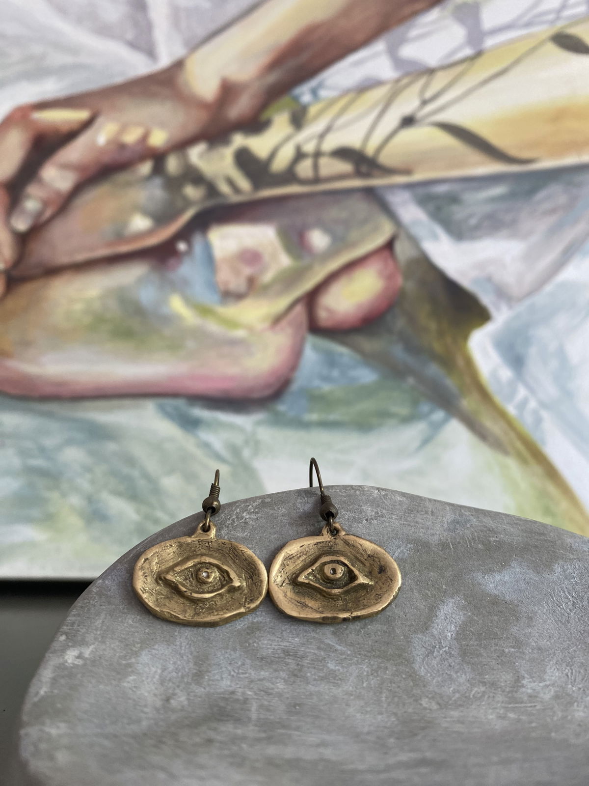Aros de bronce con ojos tallados, de forma pequeña y expresiva. El relieve del diseño aporta profundidad y presencia a la pieza, funcionando como un gesto gráfico y simbólico.