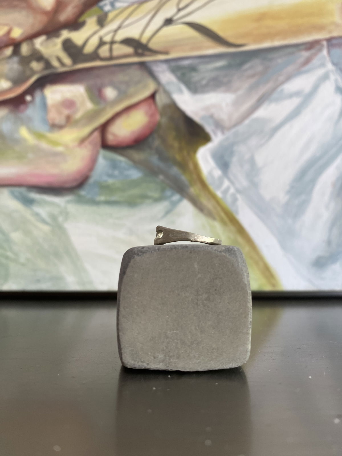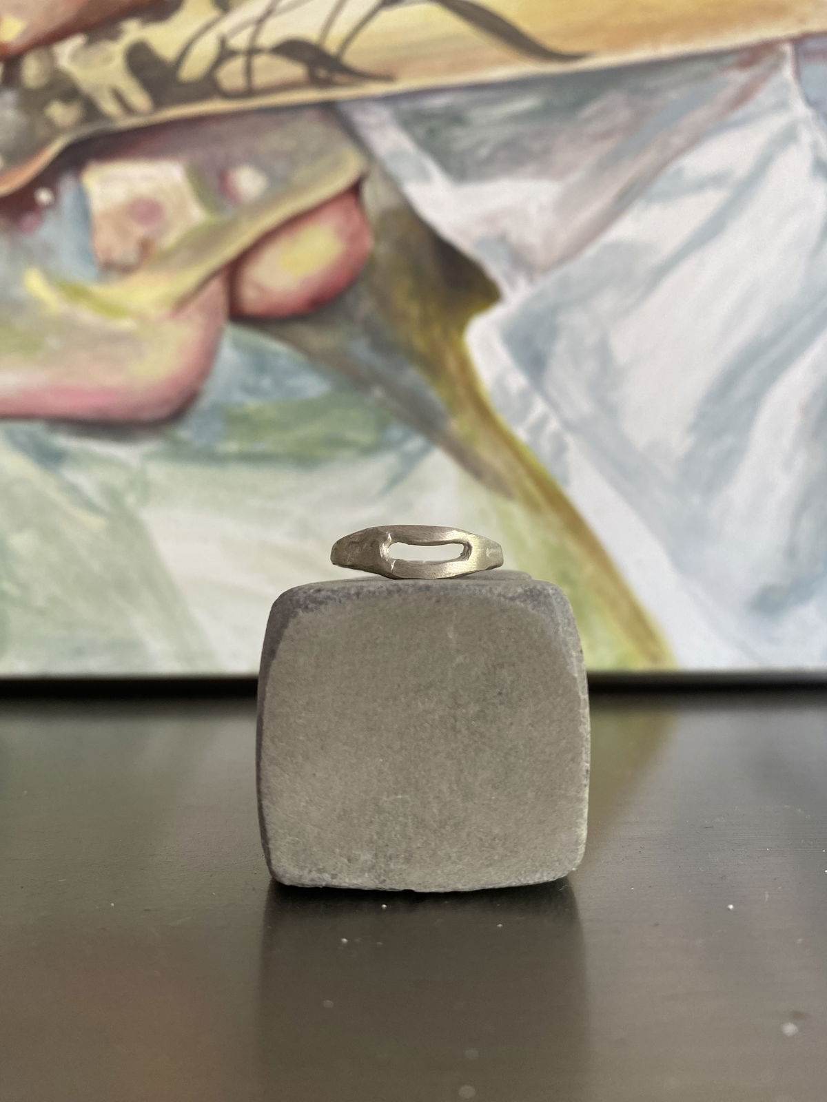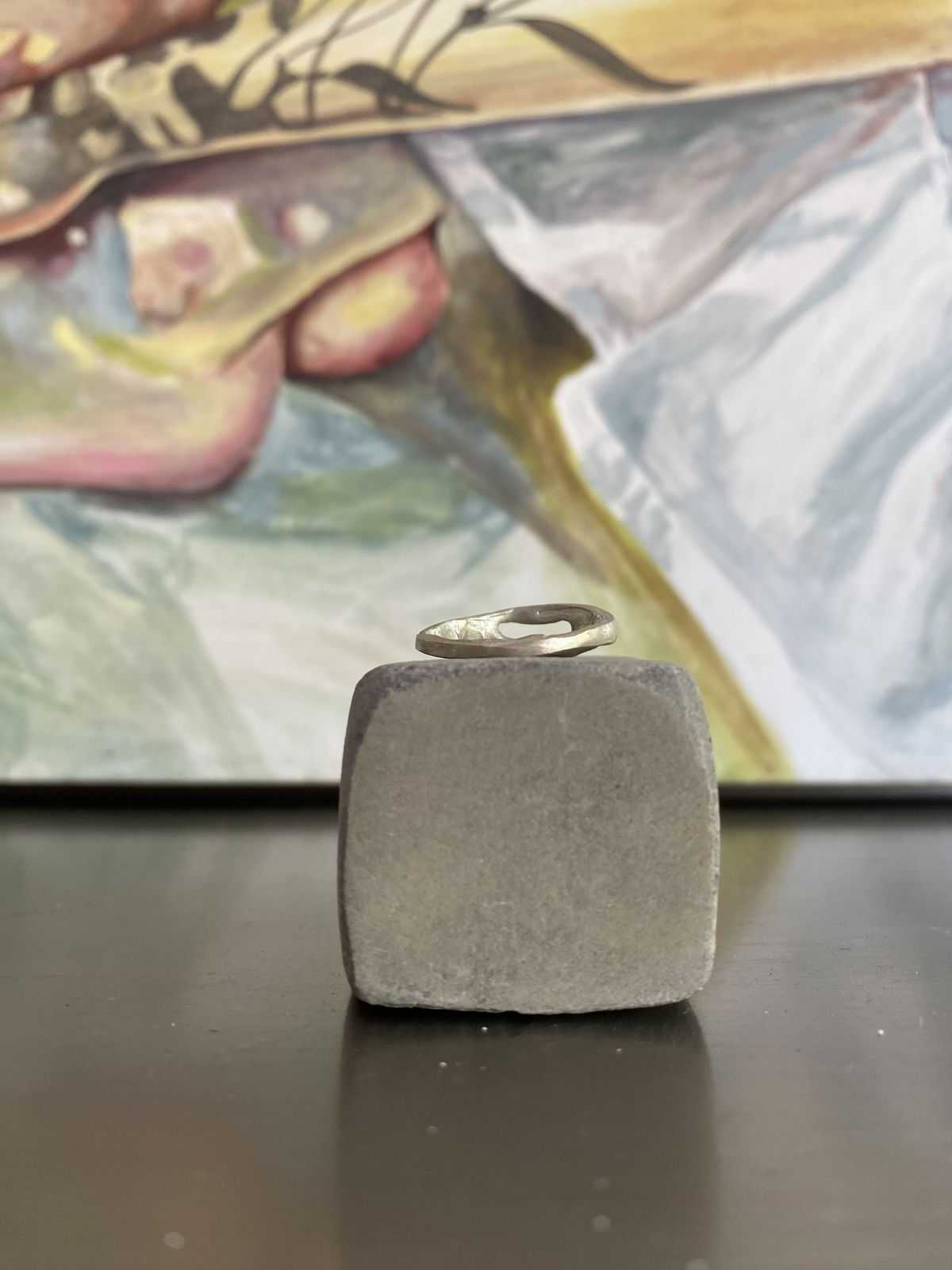 Anillo fino de plata, de contornos orgánicos y formas suaves. Líneas irregulares que conservan la huella del trabajo manual, generando piezas sutiles y naturales.
